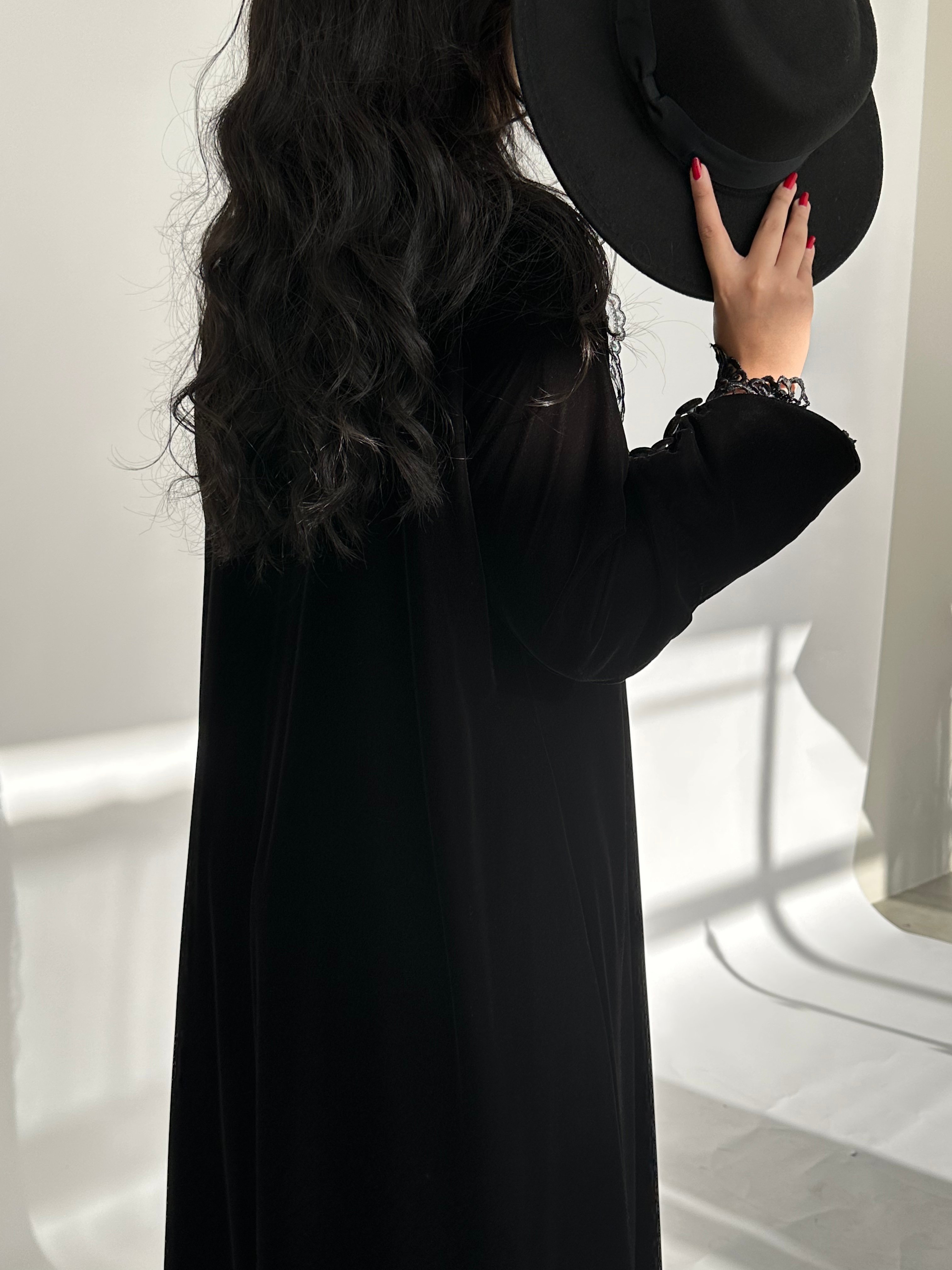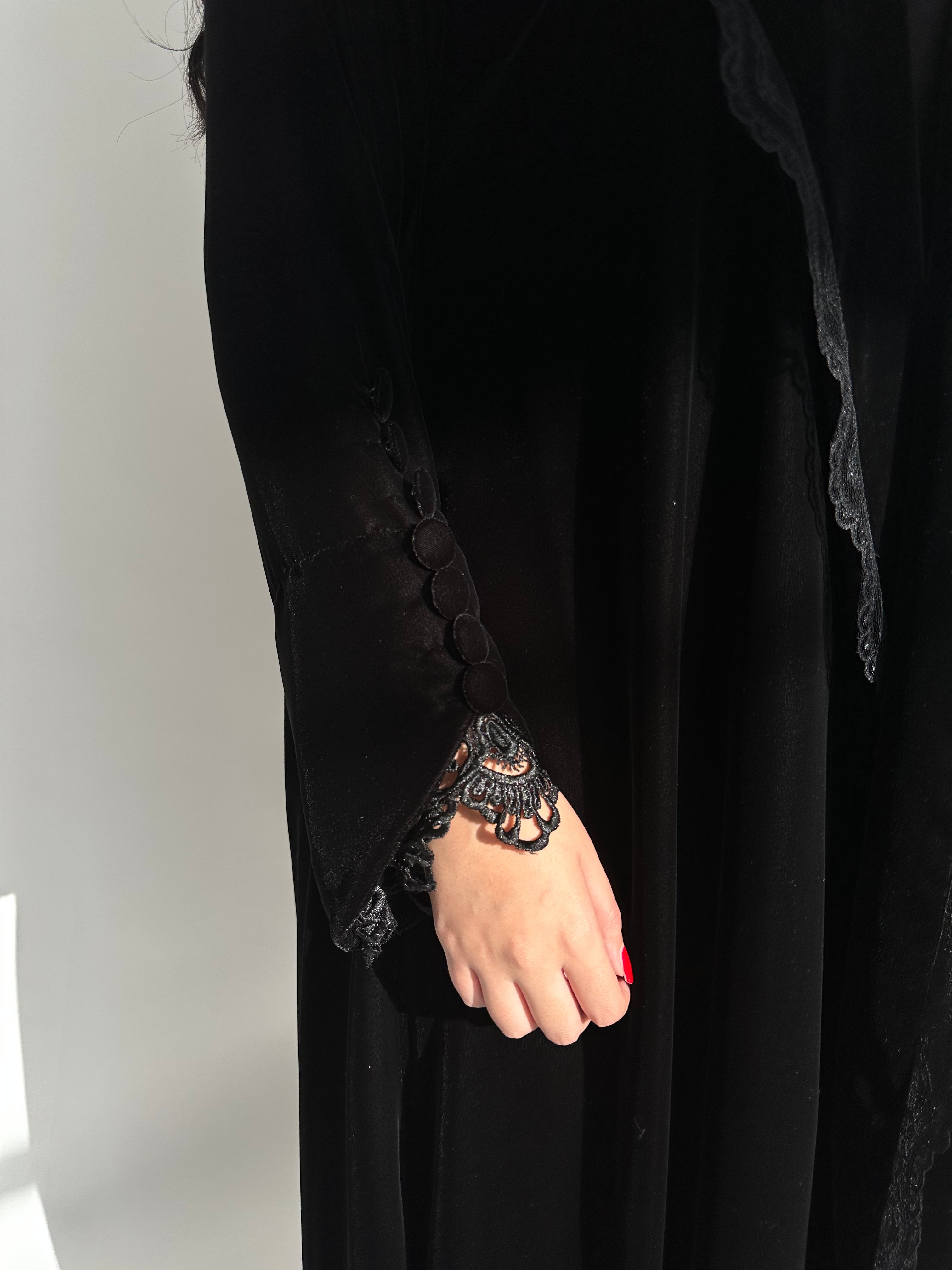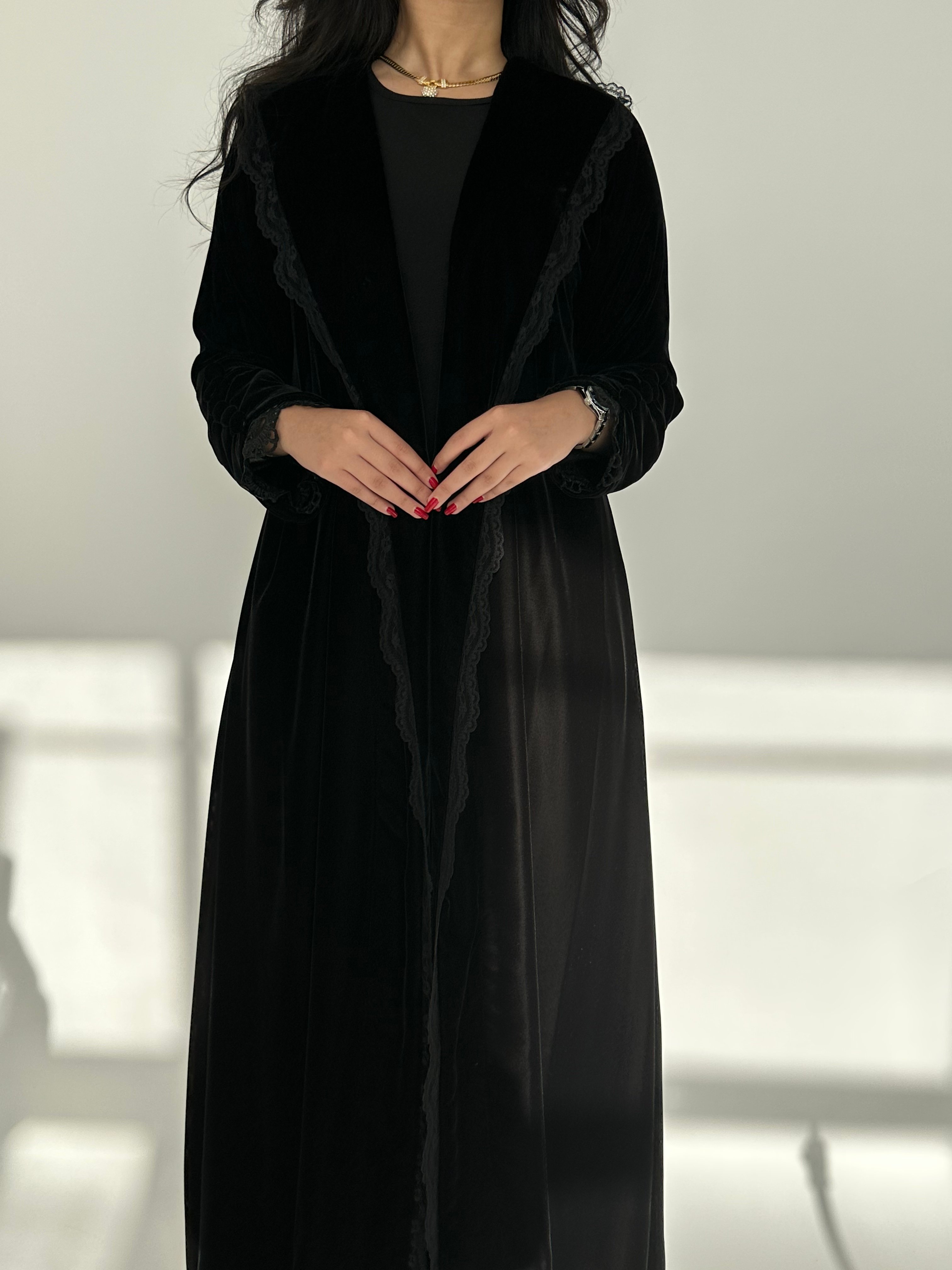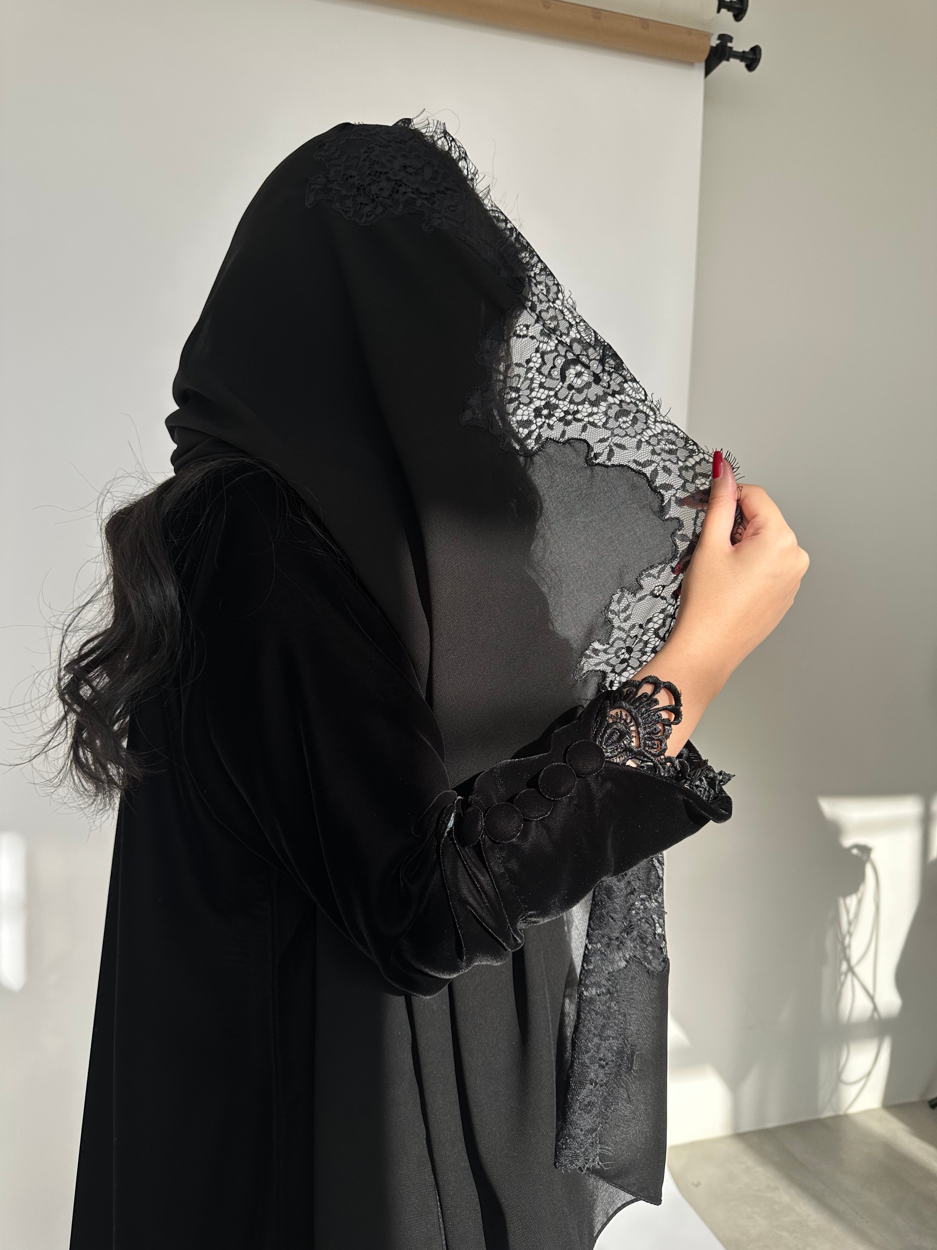 - الخامة: مخمل أسود فاخر مع تفاصيل من الدانتيل الأسود الفاخر.