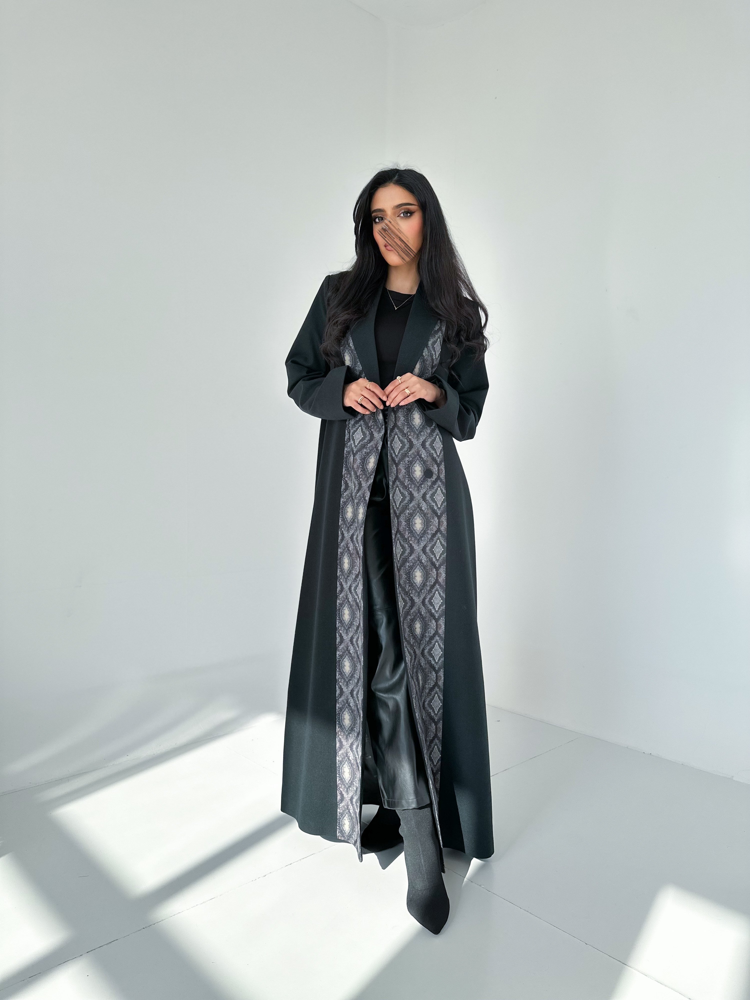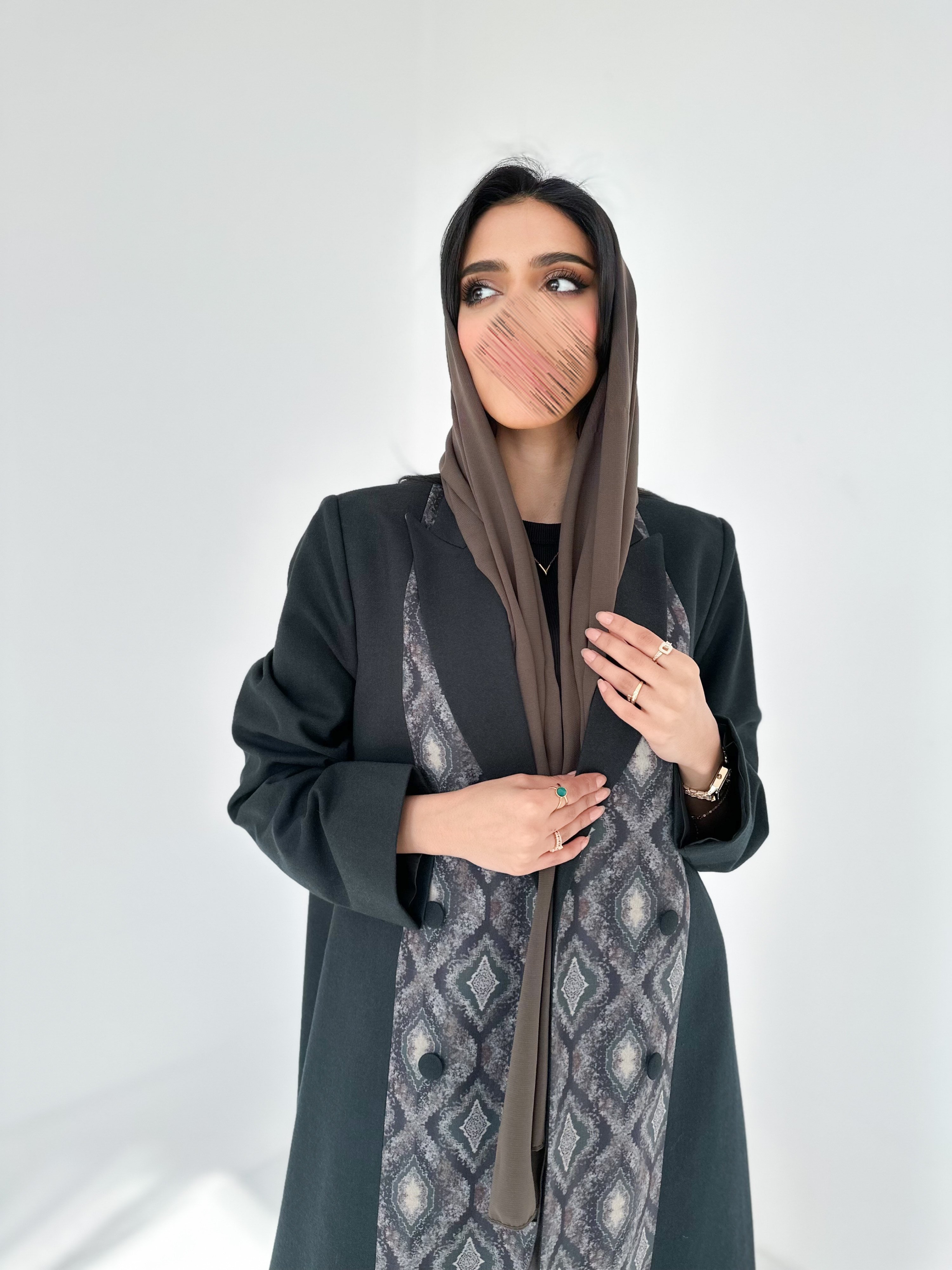 عباية جوخ زيتي ولنن هندي بيج قصة بليزر نص كلوش+ طرحة بيج.