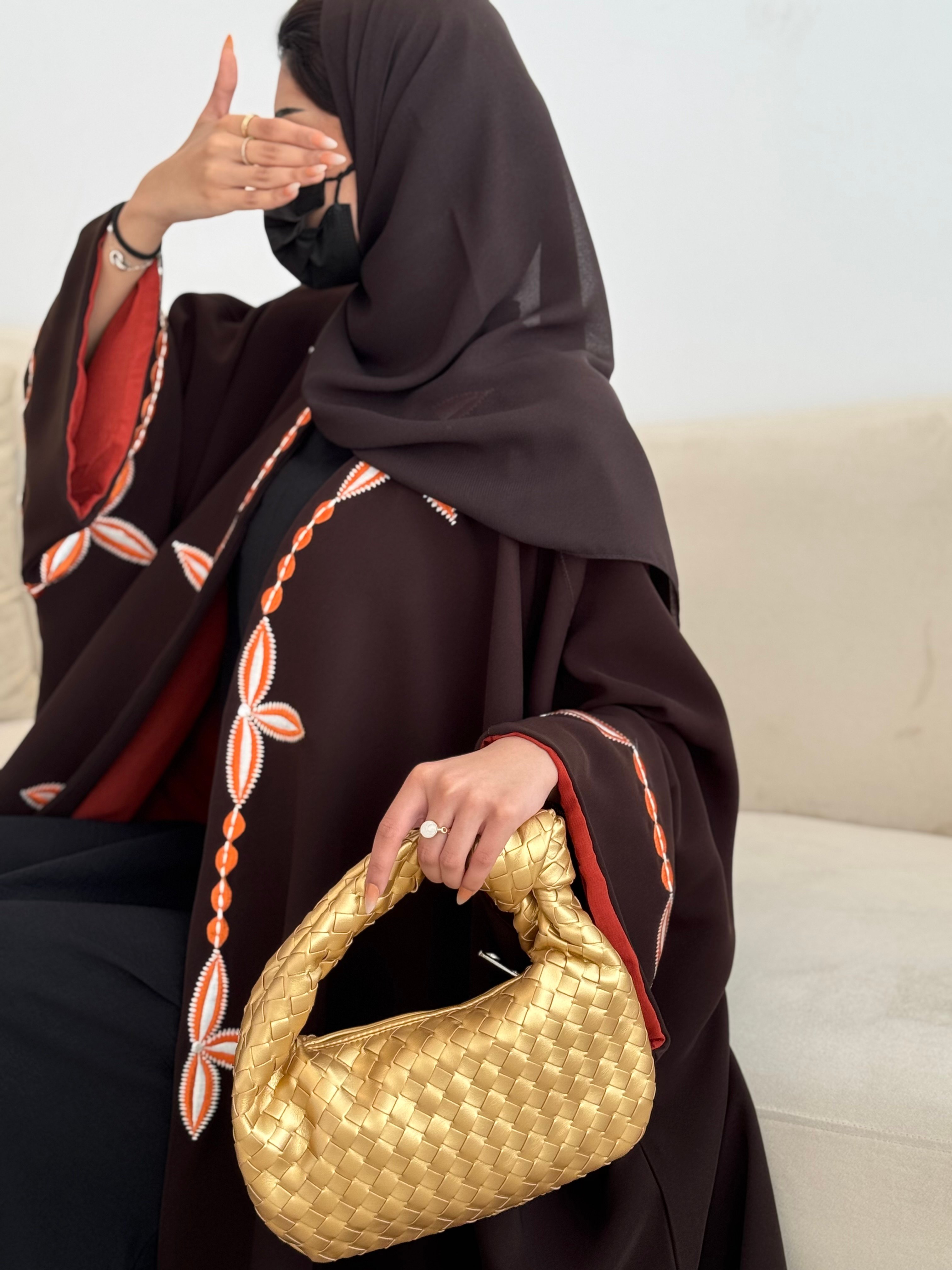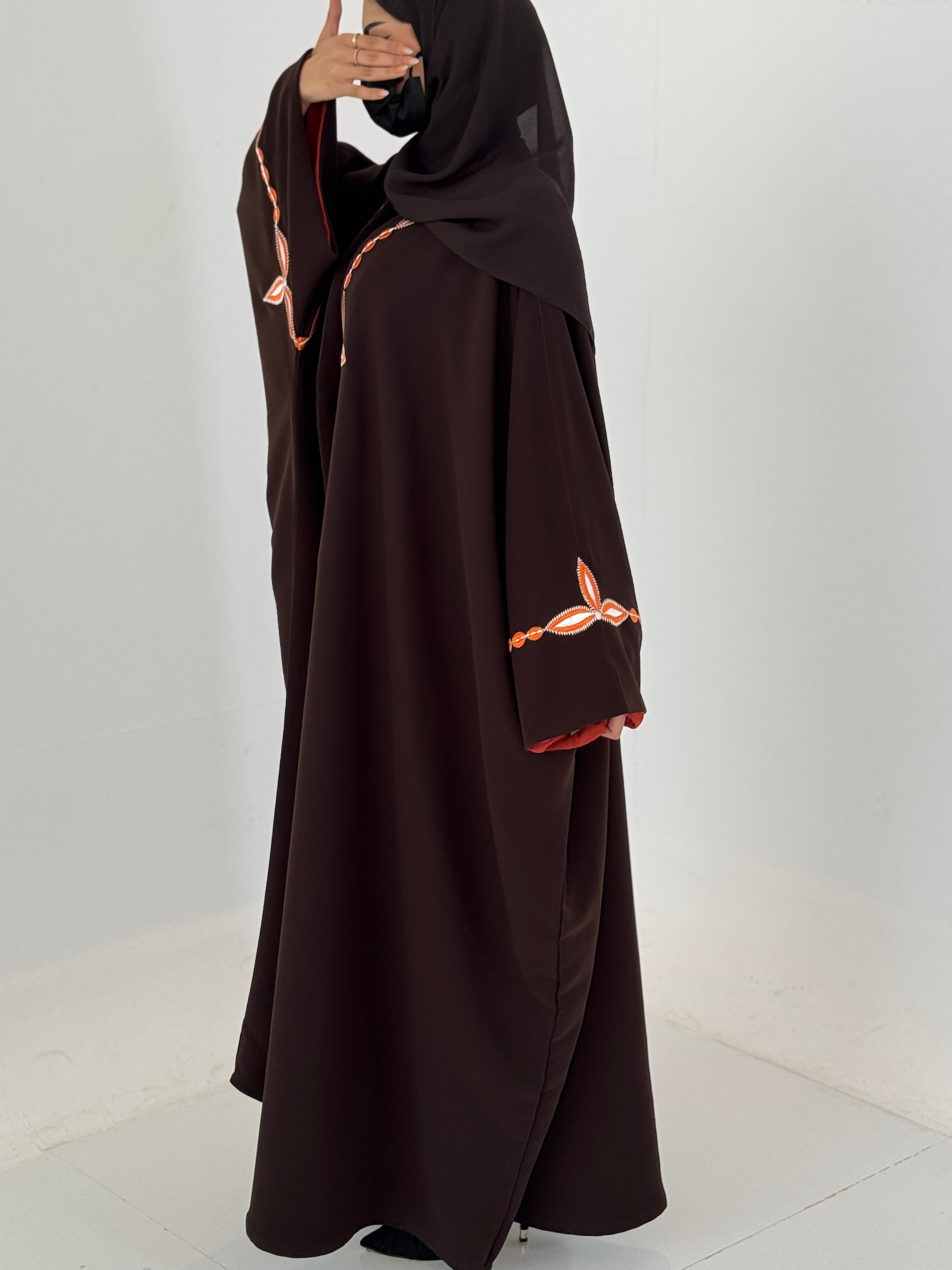 عباية كريب بني غامق هي الاختيار المثالي لكل سيدة تبحث عن إطلالة أنثوية فاخرة ومميزة. مصممة من كريب أندونيسي مبطن مع شيفون برتقالي يضفي لمسة من الأناقة والجمال، بينما التطريز اليدوي الذي يزين الأكمام والأمام يضيف لمسة فاخرة تُكمل التصميم العصري. القصة الفراشة تضيف للعباية حركة وأناقة، مما يجعلها مثالية للمناسبات الخاصة. مع الطرحة البني الغامق المتناسقة، توفر العباية إطلالة متكاملة تجمع بين الفخامة والراحة.