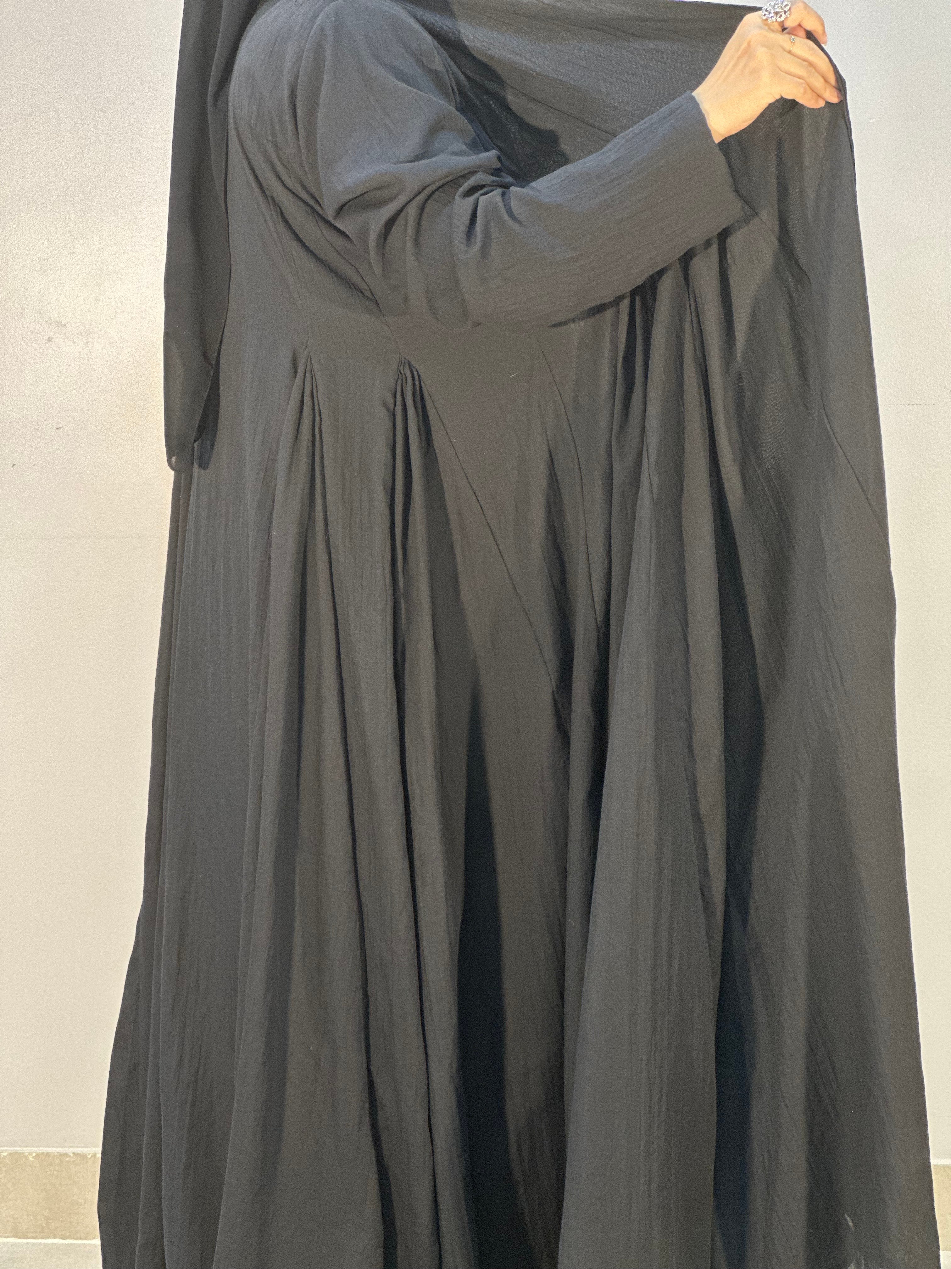 عباية كلوش اسود من متجر عبايات دعجاء الاختيار المثالي , مصممة من قماش قطن هندي وشيفون عالي الجودة ، تتميز العباية بتصميم كلوش كامل مع كسرات من الأمام والخلف، مما يضيف لمسة من الفخامة والحركة على الإطلالة. الطرحة السوداء المتناسقة تكمّل مظهركِ وتضيف لمسة نهائية أنثوية. العباية مثالية للمناسبات الخاصة، وتناسب جميع الأوقات .